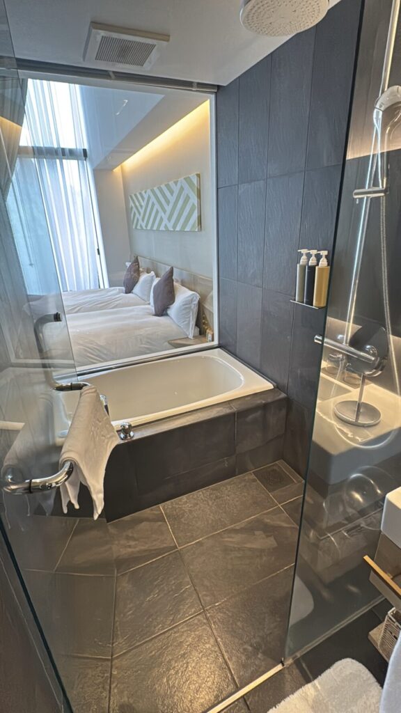 バスルームはガラスの仕切りで寝室側とつながる造りになっており、こちらも開放感があります。レインシャワーが完備されていて、使い心地は良好でした。ただ、前回宿泊した部屋と比較すると、浴槽が少し小さめだと感じました。また、前回は「酒風呂」の演出がありましたが、今回の部屋では用意されていませんでした。部屋タイプによって設備内容が変わる点は注意が必要です。
