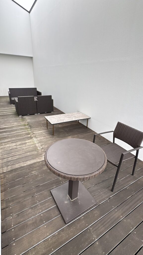 テラスにはウッドデッキが広がり、ラタン素材のソファとテーブル、ハイチェアが置かれています。時期によってはここでゆっくりとお酒を楽しんだり、朝の空気を吸いながらコーヒーを飲んだりできそうです。4月の宿泊でしたが、夜は少し肌寒く感じる場面もありました。虫が少ない季節ならテラスでの滞在時間も長くなるでしょう。夏はプールサイドと同様に虫対策が必要かもしれません。