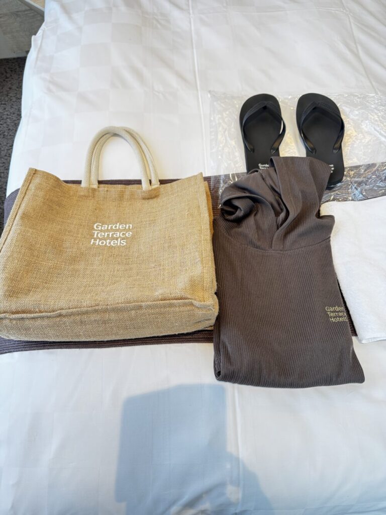 サウナ・プール向けの貸出セットが部屋に用意されていました。Garden Terrace Hotelsのロゴが入ったジュートトートバッグ、ポンチョ、サンダルのセットで、すべて無料です。妻はこの点に特に感動していました。「水着さえ持ってきたらあとは全部揃っている」という安心感は、旅慣れた大人夫婦にとって非常にありがたいサービスです。なお、水着レンタルは1,100円で利用可能です。