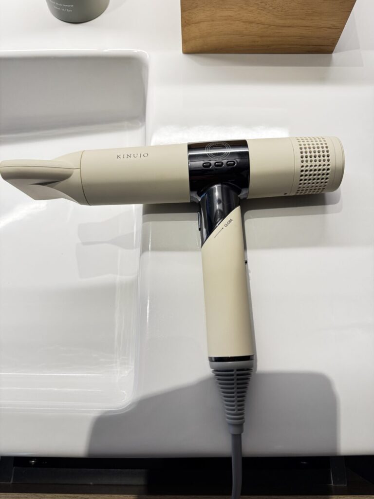 アメニティ面では、BOSEのオーディオシステムやダイソンの空調家電、ネスプレッソのコーヒーマシン(ドリップポッド)が備わっています。無料のミネラルウォーター(ななやま天然水)も置かれていました。ドライヤーはKINUJOを使用しており、こうした家電の質にこだわりが感じられます。