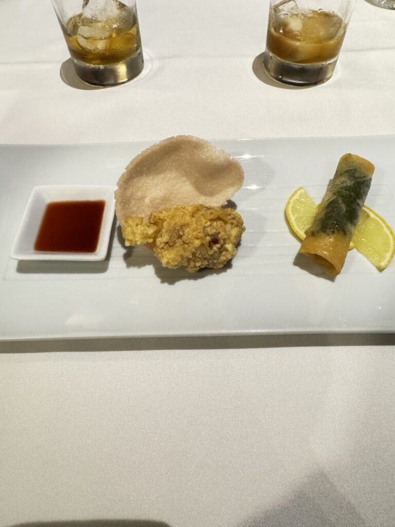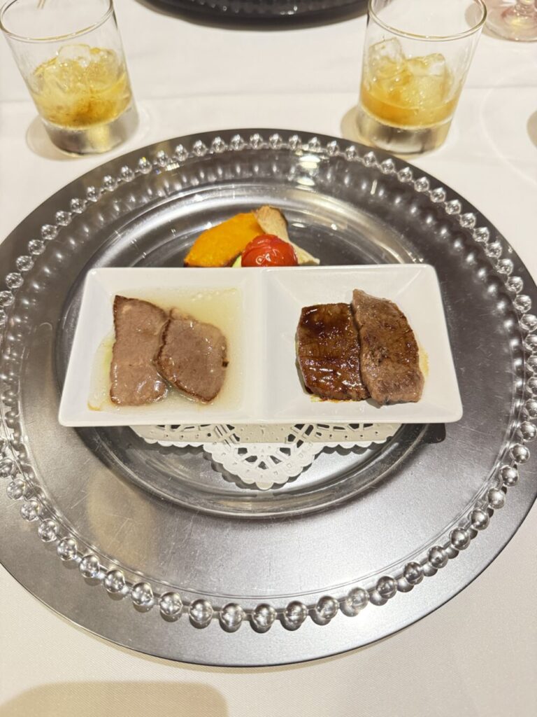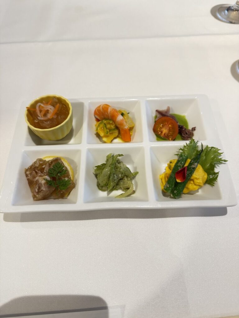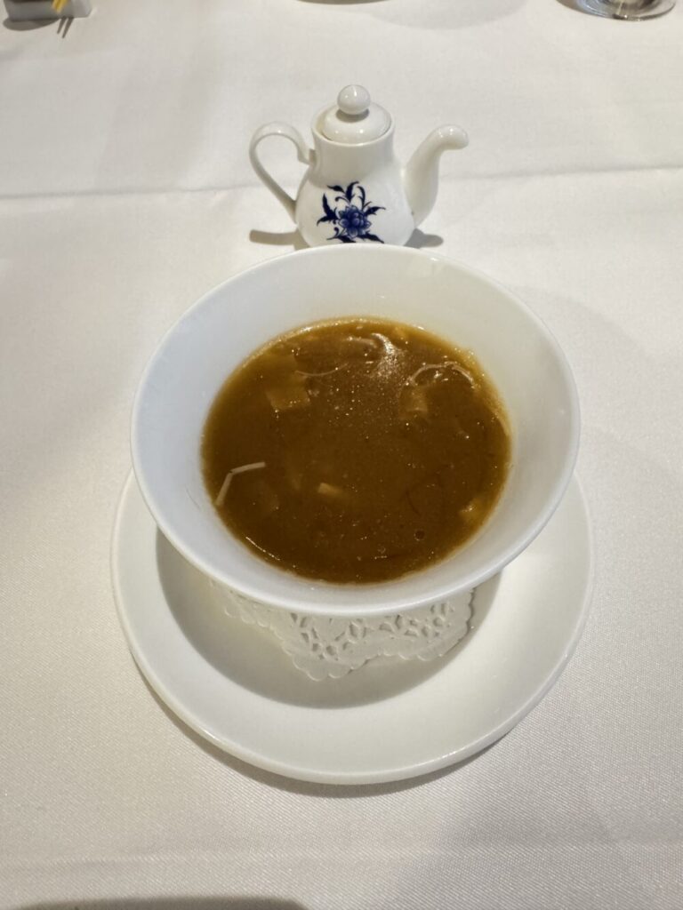 妻が一番喜んでいたのはふかひれスープです。とろみのある上品な仕上がりで、素材の旨みをしっかり感じられると話していました。オードブルも「センスがある」と評価していて、6種の小皿がキレイに並ぶビジュアルも含めて印象が良かったようです。上の小瓶は「黒酢」で味変用とのこと、私は少し入れてみましたが、そのままの味のほうが良かったとちょっと後悔しました。