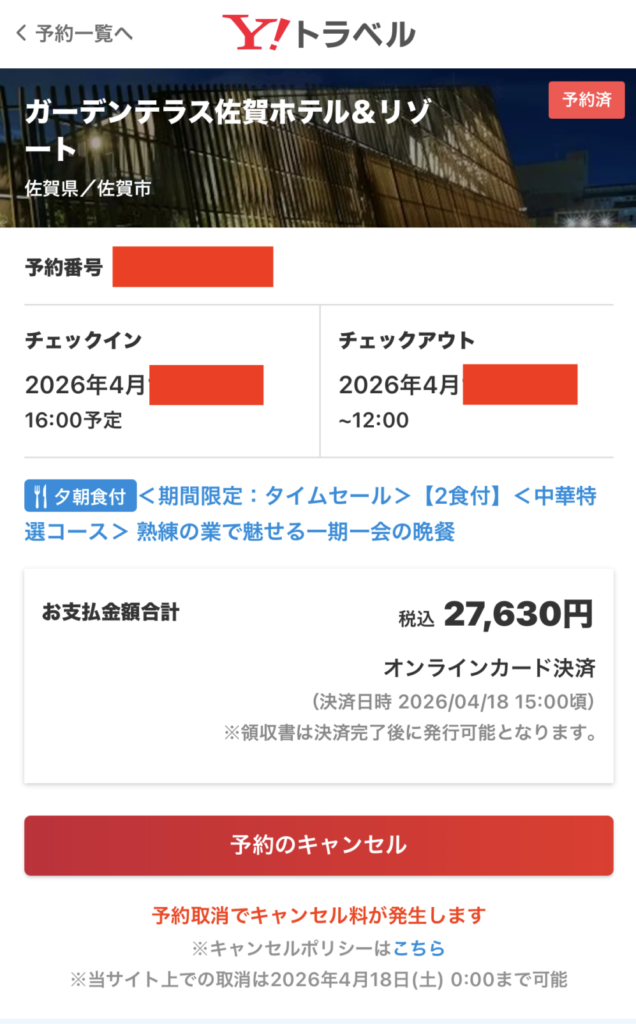 宿泊日は2026年4月、ヤフートラベルの期間限定タイムセールの時に予約し、2食付き(中華特選コース)で税込27,630円という破格の値段でした。