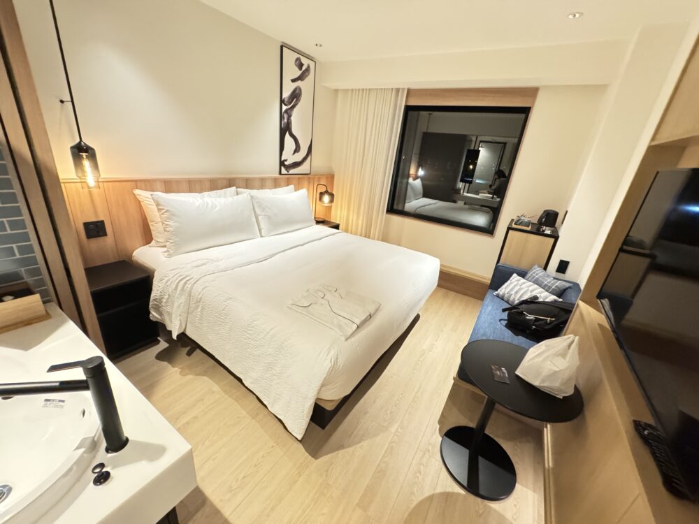 ホテルの部屋は、「寝るだけ」を想定していたので広さは、さほど広くなく必要最低限の感じです。部屋の雰囲気は、木のぬくもりを感じるシンプルなデザインと清潔感。