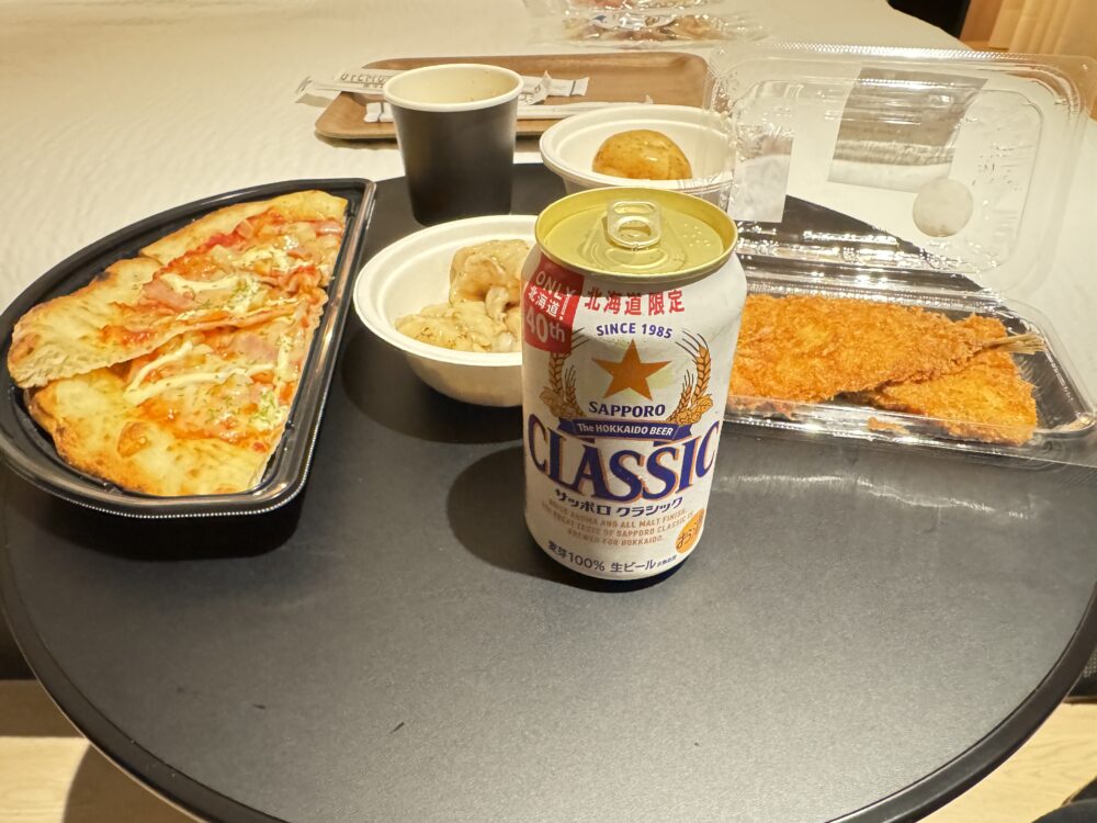 地元スーパーで惣菜を、ホテルで地元のビールを発見したので購入。翌日の朝が早いので量は控えめにし、 静かな夜を夫婦で過ごす北海道らしい時間になりました。