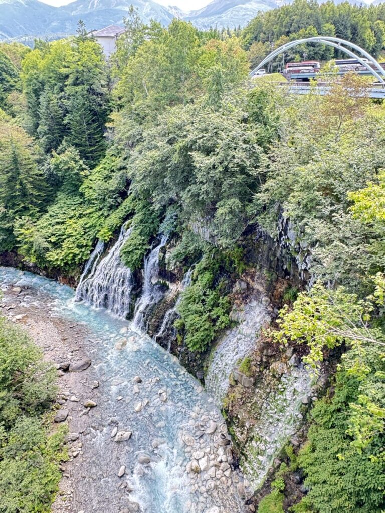 「青い池」の上流にある観光スポットで「ブルーリバー」と言われる美瑛川に流れ落ちる滝。白金観光センターの駐車場に停めることはできますが、それほど台数が多くはないため時間帯には注意が必要です。