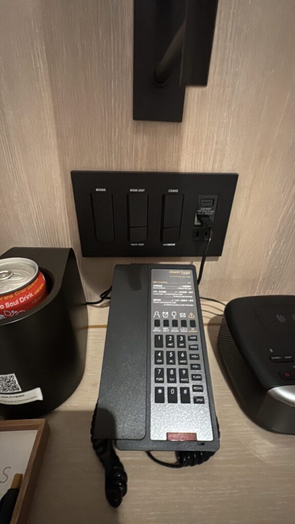 ベットサイドはお部屋の照明のスイッチと100Vのコンセント、USBのコンセントがあります。タイプCのコンセントはないので変換アダプターは必要です。