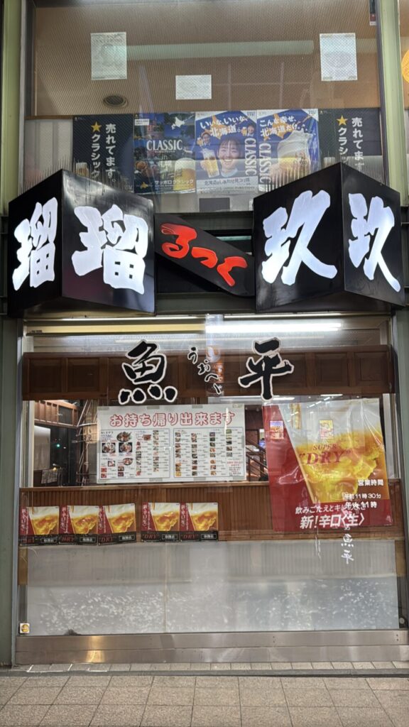 ホテルに荷物を預けたあと、すすきの街へ地下鉄で移動し街を散策しながら、お店をさがして地元の大衆居酒屋さん?「瑠っ玖」さんへ。店内は賑やかな感じで、ゆっくり楽しむというよりは「わいわい」する感じでした。