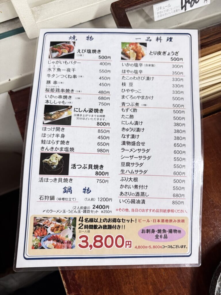 「北海道ならでは」を食べたくて、「氷下魚(こまい)一夜干し」や、妻が大好きな「うに」を注文。「うに」は思っていたほど中身が少なくてちょっと残念な感じでした。