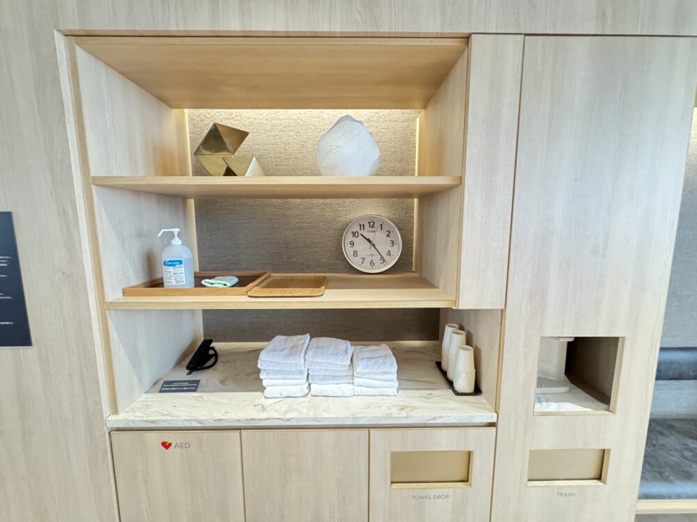 タオルは完備されいるのでお部屋から持っていく必要はありません。少し影になっていますが右側の白いのは」「ウォーターサーバー」です。ペットボトルのお水は準備されていませんが、水分補給には問題ありません。